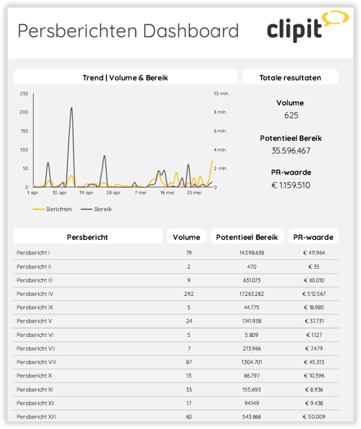 Steeds vaker brengen de wensen en behoeften van onze opdrachtgevers ons op nieuw ideeën. Zo lanceerden we onlangs een speciaal Persberichten Dashboard. In dit dashboard zie je makkelijk welke persberichten goed of minder goed presteren, doordat we in 1 overzicht inzicht geven in de impact van je pro actieve persbenadering.